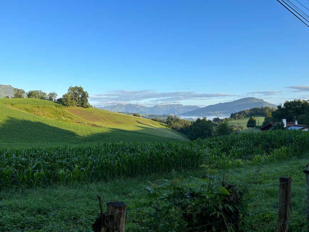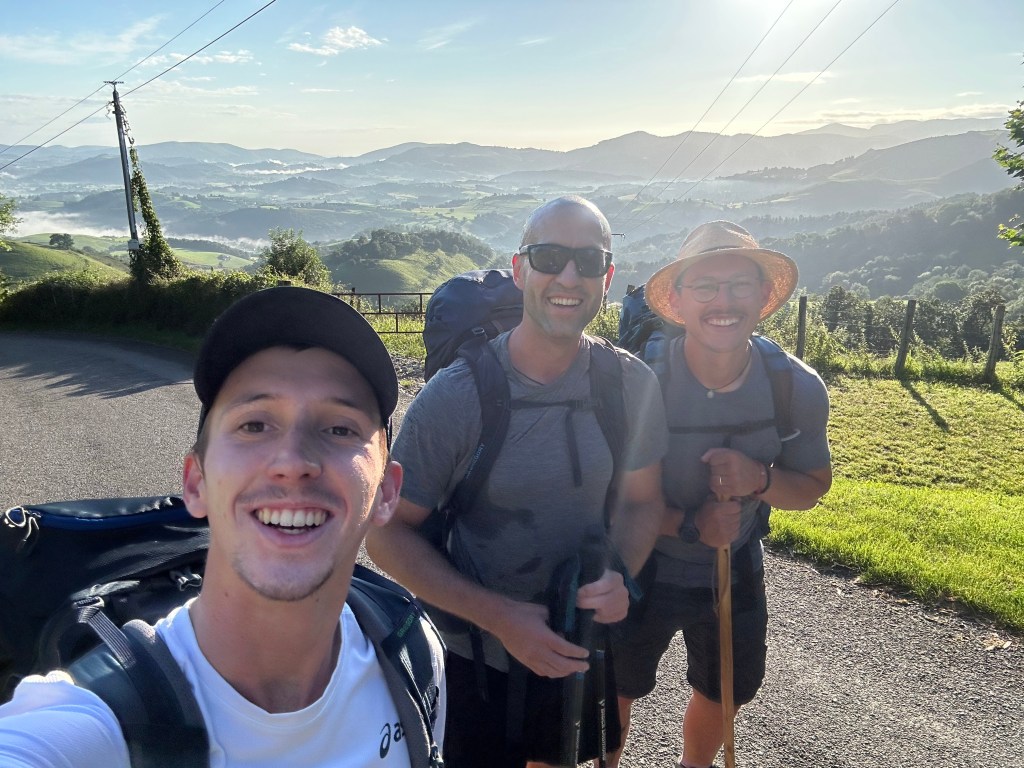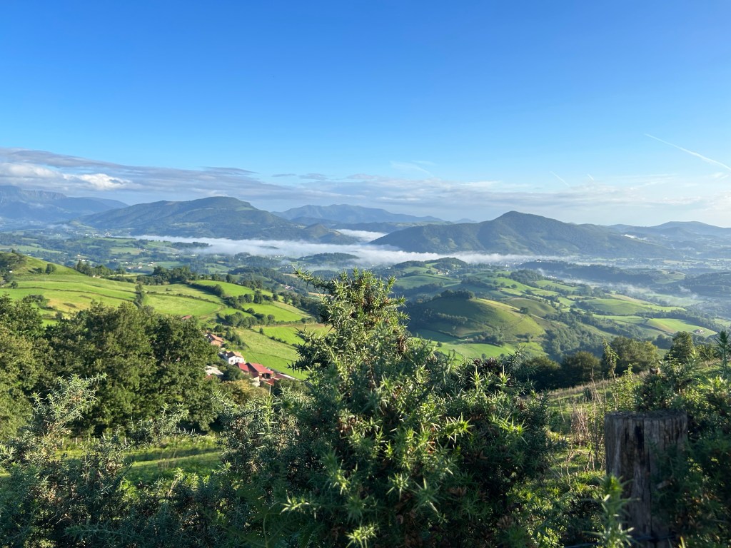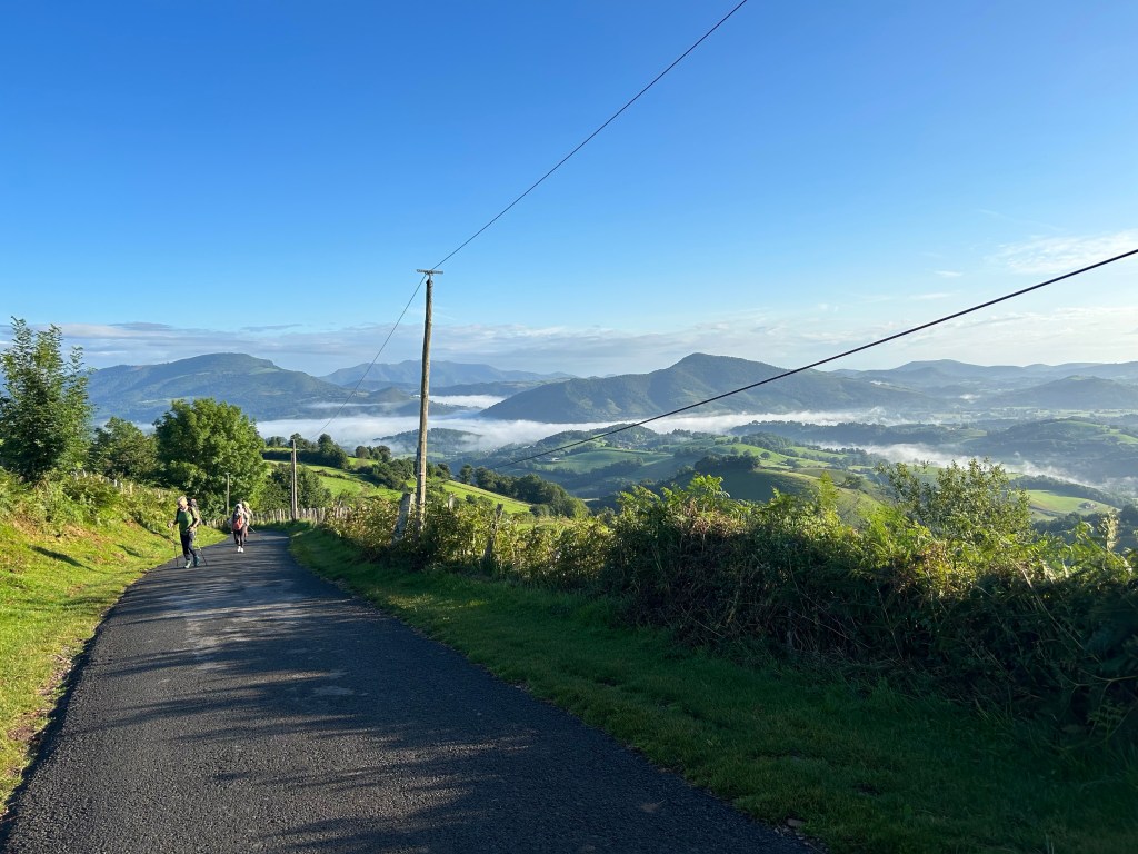 I walk west through St Jean Pied de Port. I don’t make it out of the city before I run into Daniel, a German man who just quit his job in finance to walk the Camino. He introduces me to a couple from France, Charlie and Cami, who were married last year and have been on the road to Santiago since march as their honeymoon. They are buying pain au chocolat to stuff in their bags for the big day. We walk together from there, and actually spent the entire day together. Walking up the road, it was narrow at first and cars were flying down. I’m sure the locals see so many pilgrims, they don’t mind to slow down much. we proceed up the hill, and see increasingly breathtaking views as we ascend.