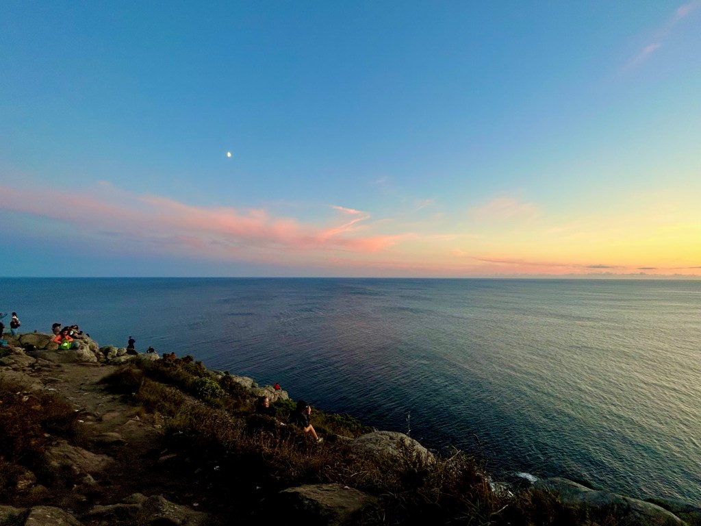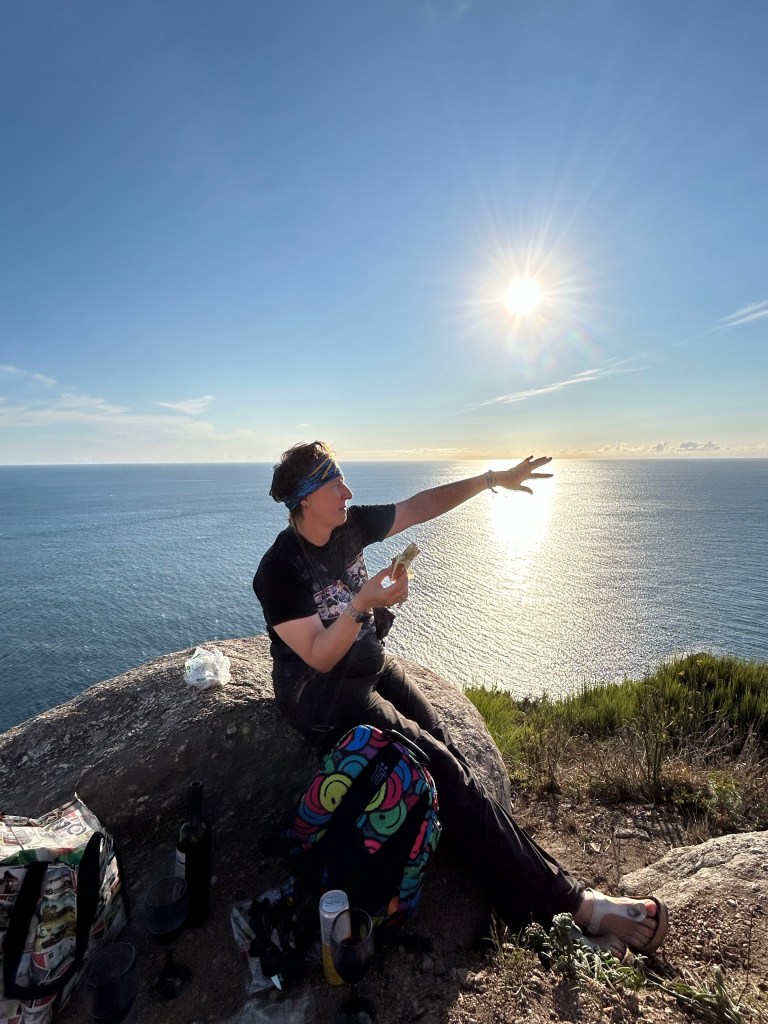 I was so happy to be back in Finisterre, and this time with some friends. Plans were made to see the sunset at the lighthouse, where we heard the views would be unbelievable. Until then, we made the most of our time by walking on the beach, searching for the best seashells, and enjoying this reward after reaching Santiago. We weren’t quite sure what to do for dinner but we made loose plans to have a picnic at the lighthouse. We all met at one of the local supermarkets and picked out various things to eat while watching the sunset. The walk up to the lighthouse wasn’t short… about 4km from the town. Of course, nothing we weren’t used to! The crowds at the lighthouse were a bit overwhelming, but when we walked around it for another 100m, we found a spot more or less free from others. We ate dinner sitting on the ground, and watched as the sun went behind clouds, came out again, and then scattered it’s light all across the sky before going below the horizon. It included good bread, guacamole, smoked salmon, chips and more. Of course, some wine was shared too. Géonne played her music, and it was a touching moment seeing our first sunset at the “end of the world.”